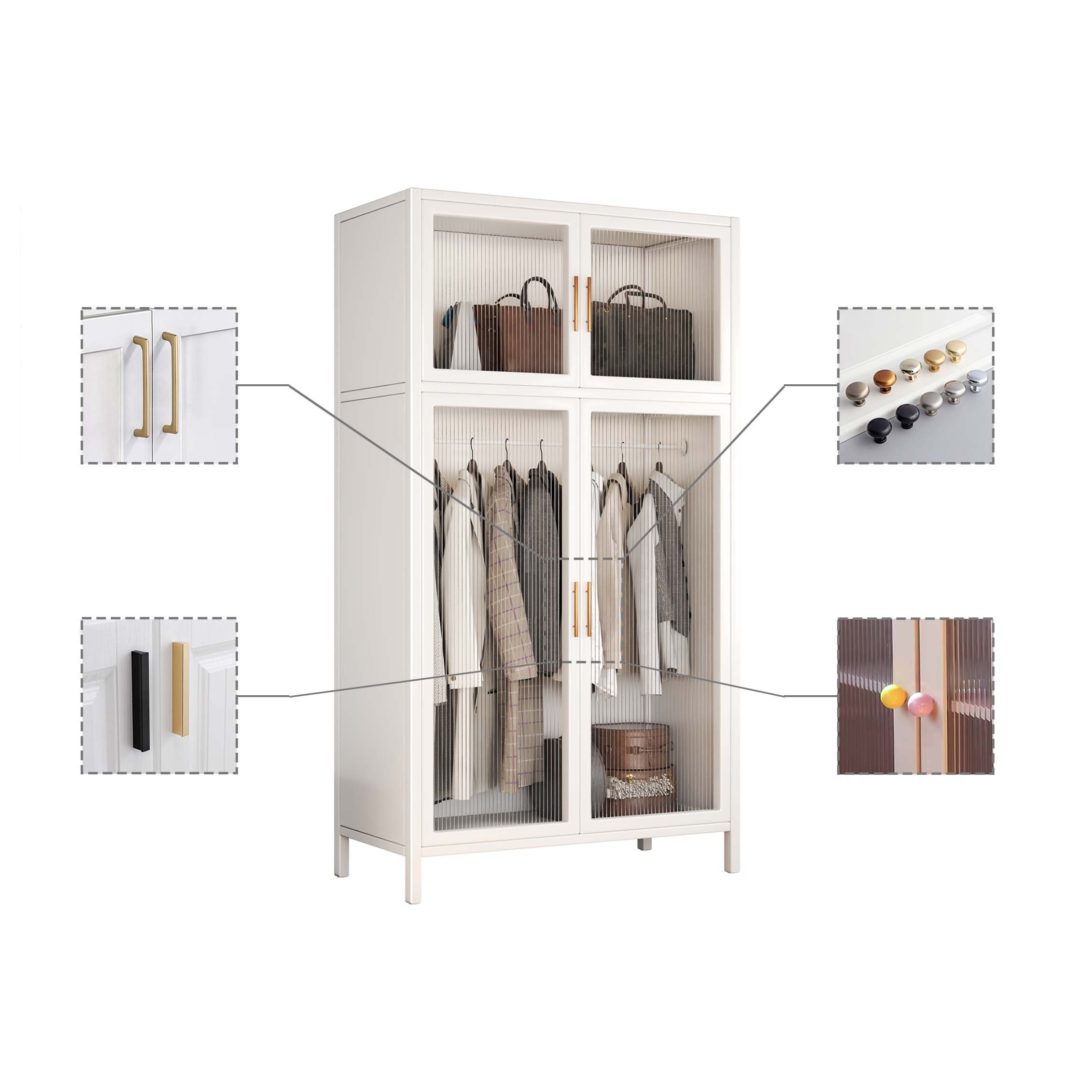 The clothes wardrobe provides versatile options. Handle options have metal, plastic material and various of design. Door panel configurations include glass, sunlight panel, acrylic, etc. Each unit have one hanger for different size clothes, and the hanger are adjustable as the request height. Customized size can tailored your needs.