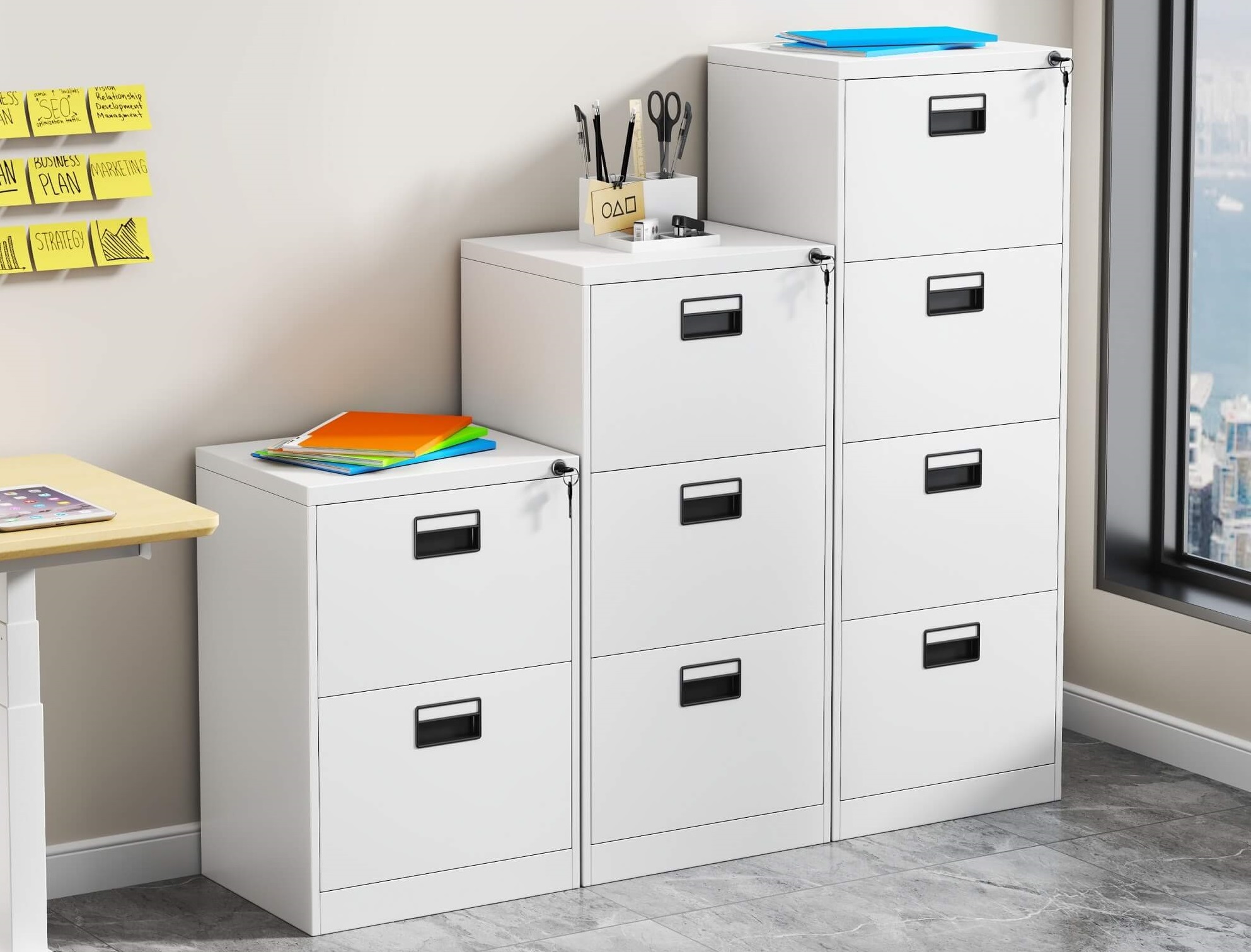 Vertical filing cabinet provides 2/3/4 drawers options. Each drawer has movable file bar for adapting hanging different sizes files. Easy-to-grip handle and fully extension ball-bearing sliding rail for smooth and quite opening and closing. The filing cabniet fits in office, study room, living room, etc.