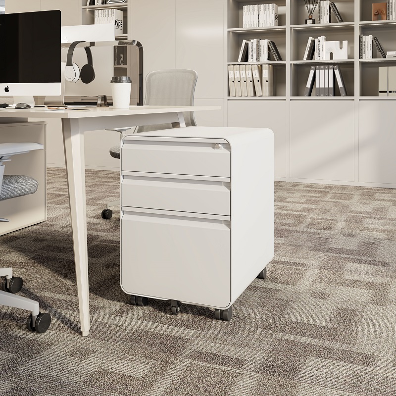 Mobile pedestal cabinet have 2 small stationery drawers and 1 large, the first drawer contains an adjustable pencil tray. Handle design options have swanneck handle, pull side handle, embedded handle, etc. Each tier equipped with 2 keys; 4 universal wheels with an anti-tilit wheel keep pedestal movable and prevent tipping over;organize your stuff simply & easily.