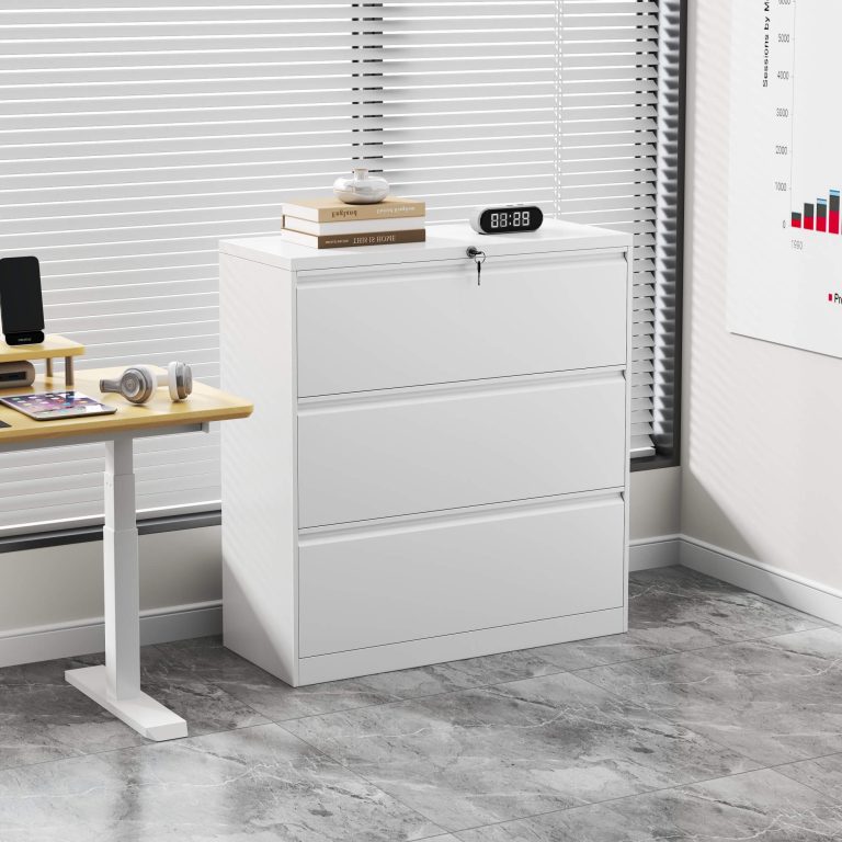 Lateral filing cabinet provides 2/3/4 drawers options. Each drawer has movable file bar for adapting hanging different sizes files. Easy-to-grip handle and fully extension ball-bearing sliding rail for smooth and quite opening and closing. The filing cabniet fits in office, study room, living room, etc.