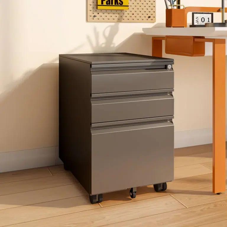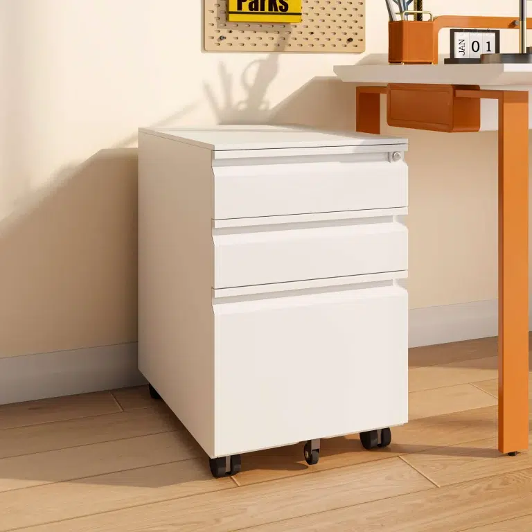 Mobile pedestal cabinet have 2 small stationery drawers and 1 large, the first drawer contains an adjustable pencil tray. Handle design options have swanneck handle, pull side handle, embedded handle, etc. Each tier equipped with 2 keys; 4 universal wheels with an anti-tilit wheel keep pedestal movable and prevent tipping over;organize your stuff simply & easily.